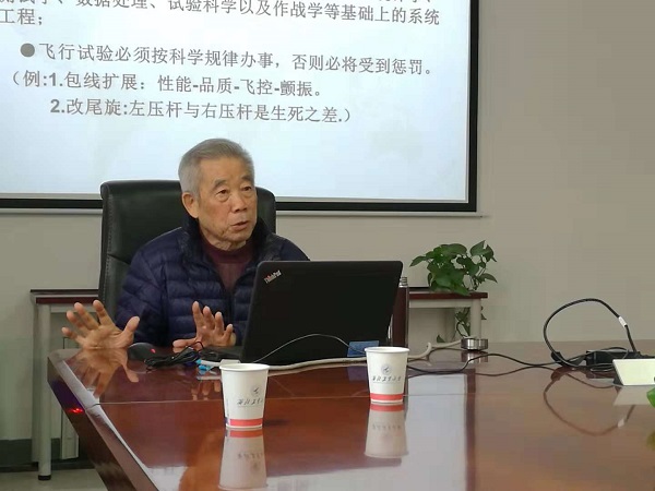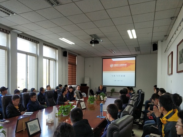在师生们的热烈掌声中,周自全开始报告,他幽默的说:“今天是作为你们的老学长,没有总师教授,大家畅所欲言。”报告在轻松幽默的氛围中进行。在主题为“飞机飞行试验”的报告中,他首先用一句名言定义了试飞的重要性:To design one is nothing;To build one is easy;To fly one is everything Otto Lilienthal(对一型新机来说,只有试飞成功才算研制成功)。随后,他对具体飞机飞行试验过程、特点、分类、技术和发展趋势并且结合自身经历的相关实例向同学们进行了详细讲解。最后,结合试飞人才的相关需求,周自全希望同学们在校期间学好相关专业知识,本着报效祖国的情怀,勇于担当、积极投身在伟大事业的建设中。
