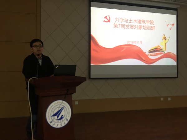 力学与土木建筑学院第7期发展对象培训班于11月7日下午4点在学院报告厅正式开课。本次课程的主讲老师是学院本科生辅导员侯恬,学院全体发展对象参加培训,培训由辅导员牛茂贵主持。