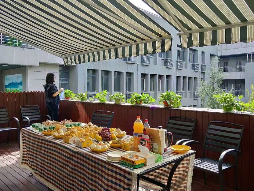 三楼阳台,和风煦日,金桂飘香,老师和学生们早早将三楼阳台装扮的温馨闲适,几盆绿萝,一块桌布,装上美味的点心、水果,泡一壶香郁的红茶,期待享受一段悠闲的下午茶时光。