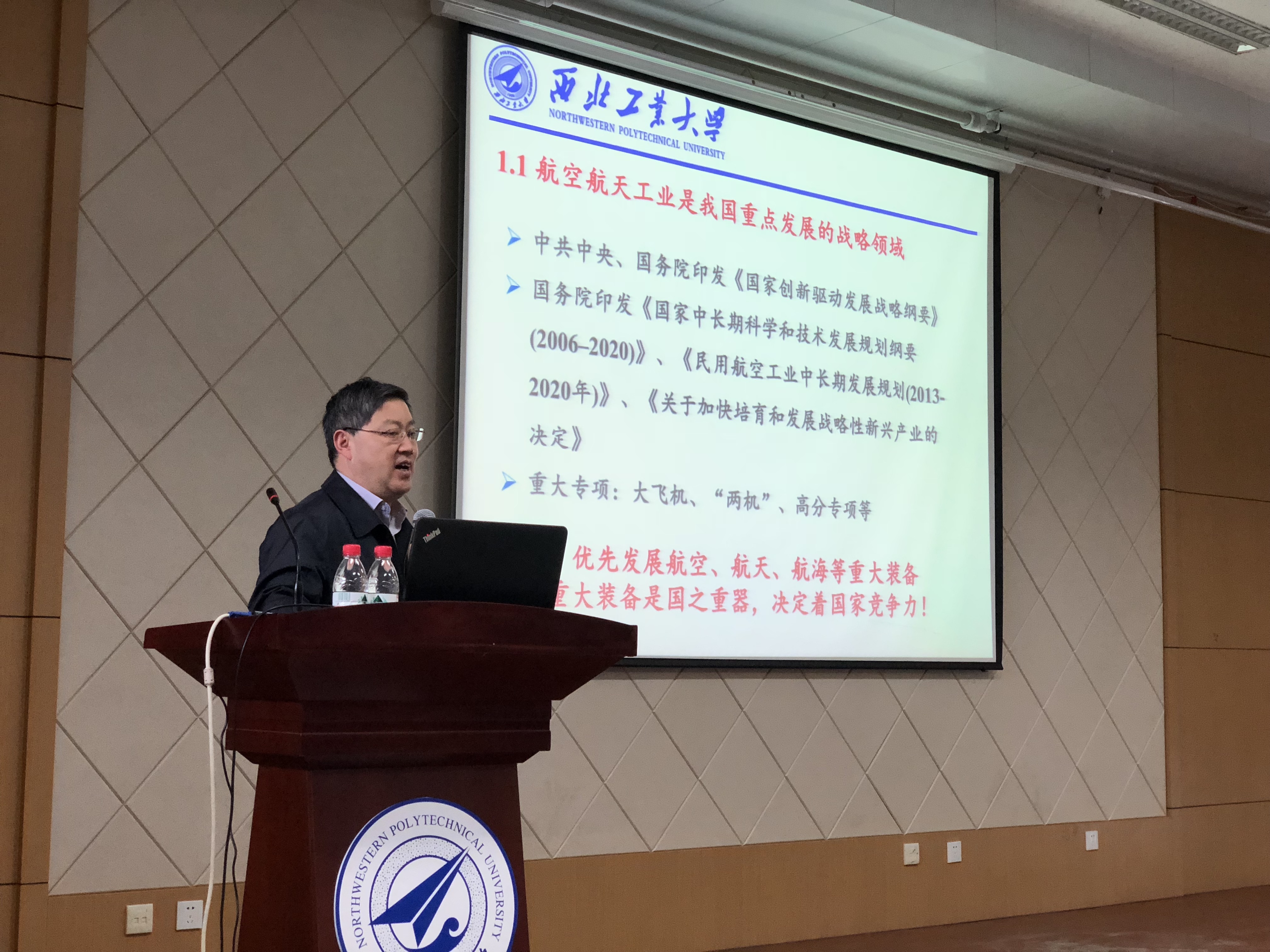 接着,在同学们的热烈欢迎下,岳珠峰教授开始了他的讲座。报告会主题为“飞行器及动力装置结构系统设计”。岳教授首先引用了习近平总书记近日在考察三峡工程时的指示,“大国重器必须掌握在我们自己手里”,并以此为切入点向同学们介绍了“大国重器”的重要性以及国家未来重点研究的“大国重器”方向,如未来飞行器,新材料新结构等。之后岳教授向大家介绍了自己团队“围绕航空航天重大装备需求和未来发展趋势,解决结构系统研制涉及的基础力学、设计、先进测试等问题,引领行业发展”的团队定位,建立“基础研究中心、基础验证中心、人才培养中心、交流合作中心”的总体规划目标,团队的研究方向,实验室情况以及实验仪器设备,近几年承担的科研任务经费等。