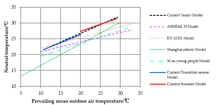 图2 西安地区老年人适应性热舒适模型与国内外模型比较