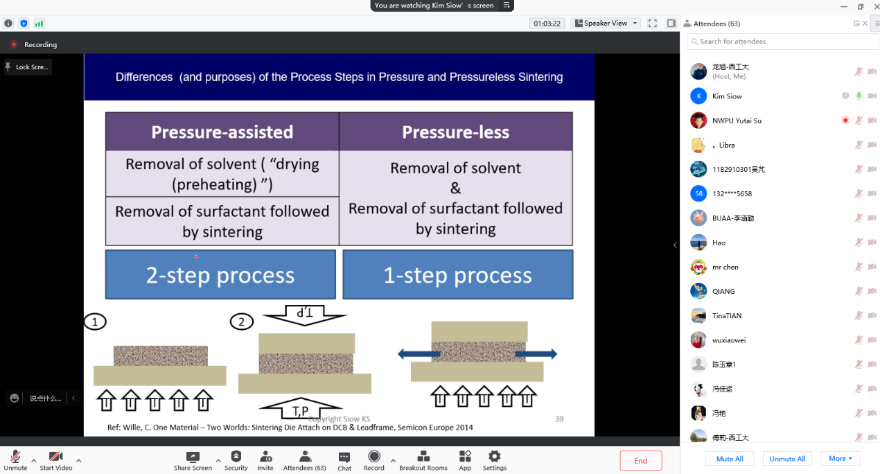 本次报告吸引了国内外60余名学者,学者们表现出极大的兴趣并在会后展开了积极的讨论。Kim S Siow研究员的此次报告,展示了烧结银材料的研究成果以及该领域的发展趋势,在一定程度上促进了烧结银材料的封装应用成熟度及可靠性的发展。