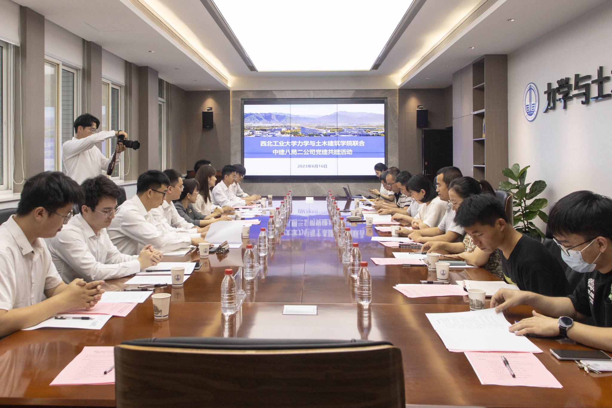 为贯彻落实党的二十大对教育、科技、人才工作的指示精神,深入推进产教融合,创新校企合作与人才培养模式,6月16日上午力学与土木建筑学院联合中建八局二公司在学院206会议室开展党建共建交流活动,学院党委书记巨维博、党委副书记乔吉超、土木工程系主任侯秀慧,中建八局二公司党委副书记、工会主席张慧,人力资源部经理刘嵩,陕西公司总经济师、工会主席韩增水等出席会议,会议由乔吉超主持。
