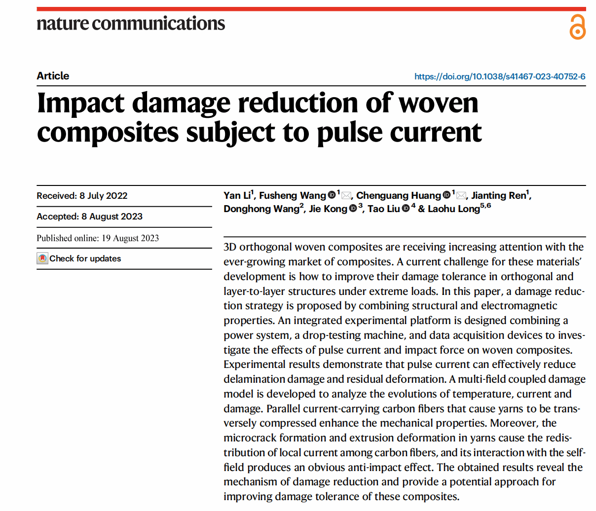 近日,国际顶级综合类期刊《Nature Communications》(自然•通讯)以“Impact damage reduction of woven composites subject to pulse current”为标题在线发表了yl6809永利集团力学与土木建筑学院王富生教授团队在复合材料损伤抑制方面最新研究成果。该工作提出了一种采用脉冲电流来改善三维正交编织复合材料抗冲击性能的方法,并系统揭示了脉冲电流对正交编织复合材料冲击损伤的抑制机理。