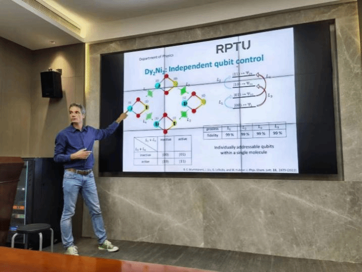Lefkidis副教授从分子体系出发,首先介绍了一种基于体系中电子自旋自由度调控来实现逻辑运算的新型自旋电子器件的设计思路,并结合片上光栅技术、分子磁体制备等近年来的实验进展,详细讲解了这种自旋电子器件设计的可行性。随后,Lefkidis副教授介绍了近年来在这一领域的多项研究工作,通过对自旋态进行编码,并在不同含磁性中心的分子体系中实现的超快自旋翻转、自旋转移等自旋动力学进程,实现了一系列逻辑门的设计。此外,还介绍了这种方法在量子计算领域的应用前景,提出了一种基于分子磁体的集成量子比特及其操控的新型量子计算平台的设计思路,这样的量子计算体系相比于现有的量子计算机,在操作时间和集成密度方面具有着显著的优势。讲座后老师同学们针对讲座内容进行了充分的讨论,Lefkidis教授也对老师同学们提出的问题给予了详细的解答。