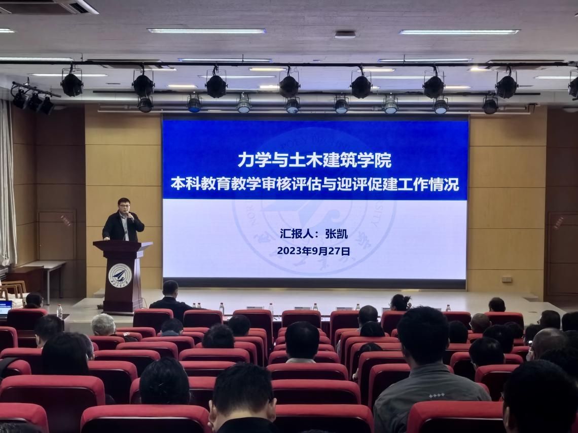 首先,副院长张凯进行了本科教育教学审核评估与迎评促建工作情况汇报。介绍了教育教学审核评估工作的基本情况,分析了新一轮审核评估的突出特点,详细介绍了学院已开展的工作、现存问题,并对学院下一步迎评工作进行了规划部署。