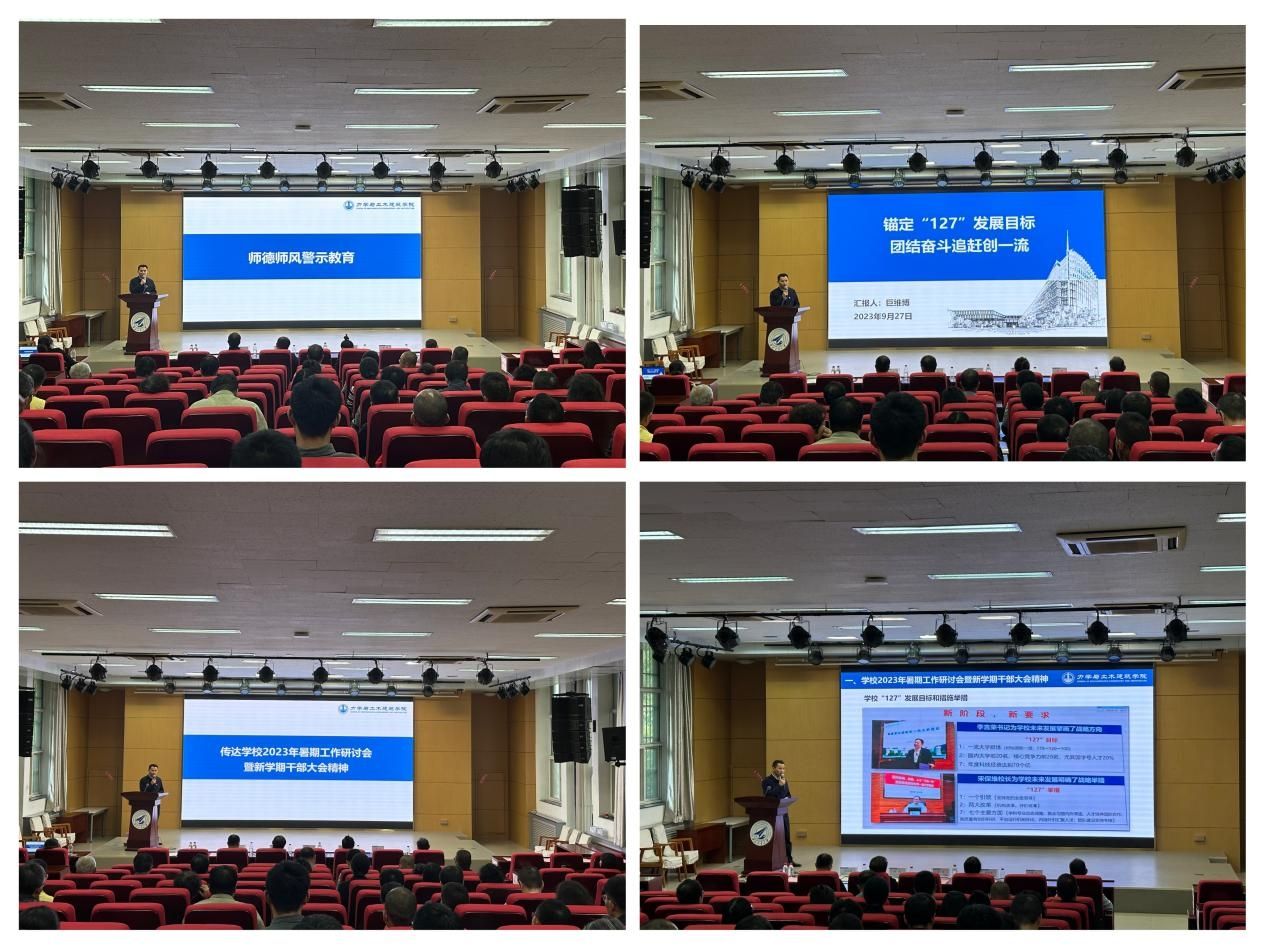接着,学院党委书记巨维博以“锚定‘127’发展目标,团结奋斗追赶创一流”为主题,向全院教职工传达了学校2023年暑期工作研讨会暨新学期干部大会精神,宣贯了李言荣书记和宋保维校长主题教育专题党课内容,明确了“127”发展目标和措施举措的重要内涵。巨维博指出,学院应切实加强政治理论学习,坚持以习近平新时代中国特色社会主义思想为指导,贯彻习近平总书记对教育、科技、人才、思想政治工作重要要求,落实学校四个行动计划,强化主题教育学习成效。强调要围绕学校“127”发展目标和学院核心发展指标加强统筹部署和顶层规划,强化党支部党建引领作用发挥,以新一轮岗位聘任为契机,以全员目标责任制为抓手,有力推动学院各项核心工作高质量发展。