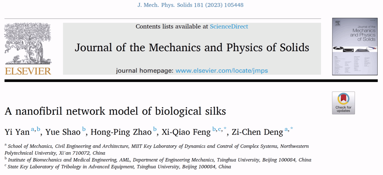 力学与土木建筑学院“复杂系统动力学与控制”工信部重点实验室邓子辰教授团队在生物纤维材料断裂力学领域取得重要进展。该工作发展了一套纳米纤维网络模型以描述生物纤维的多尺度变形、损伤和断裂过程,系统揭示了蛛丝、蚕丝等生物纤维材料的分子解折叠机制对材料宏观力学性质的影响。相关成果以“A nanofibril network model of biological silks”为题,发表在固体力学旗舰期刊Journal of the Mechanics and Physics of Solids(JMPS)上。论文的第一作者为该实验室燕翌副教授,yl6809永利集团邓子辰教授和清华大学冯西桥教授为该论文的共同通讯作者。