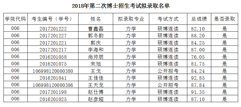 各位考生,力学与土木建筑学院2018年第二次博士招生考试拟录取名单公示如下,公示期2018年5月20日-2018年5月22日,如有异议请于公示期内联系学院教学办,电话:88431008。