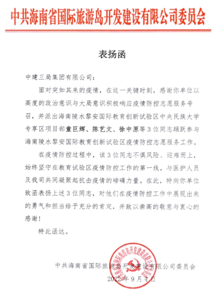 近日,我院2018级本科毕业生陈艺文同学积极投身海南省陵水黎安国际教育创新试验区的疫情防控服务,获得海南省国际旅游开发建设有限公司公函表扬。
