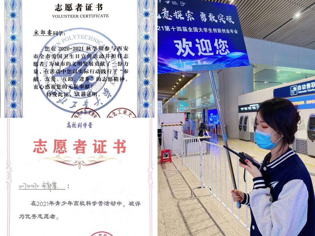参与“第十四届全国大学生创新创业年会”、“2021青少年高校科学营”、“西安市宣传日”等志愿服务活动并获优秀志愿者称号