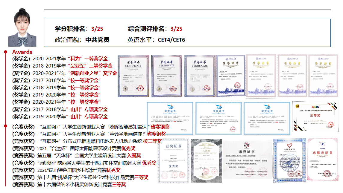 除了基本专业学习,我始终坚持理论和实践相结合。本科期间主持或参与国家级大创项目四项,发表EI检索国际会议论文一篇。为了让自己更好地适应未来学科交叉融合,我积极参与竞赛和创新创业比赛。目前为yl6809永利集团飞天创客空间创新创业孵化基地红绘工作室创业团队主要成员。参与的跨专业项目昉恩智能(脉眸科技)已于今年入驻西工大科技园。四年来获得“互联网+”大学生创新创业大赛省赛银奖、铜奖以及校赛一、二等奖,2021“台达杯”国际太阳能建筑设计竞赛优秀奖,第五届“天华杯”全国大学生建筑设计大赛入围奖,第十四届陕西省“绿地杯”大学生实体空间搭建大赛优秀奖,2021昆山特色田园乡村设计竞赛优秀奖,第十六届iCAN微纳米小精灵创新设计竞赛三等奖以及第十九届“三航杯”大学生课外学术科技作品竞赛三等奖等。