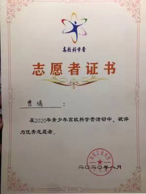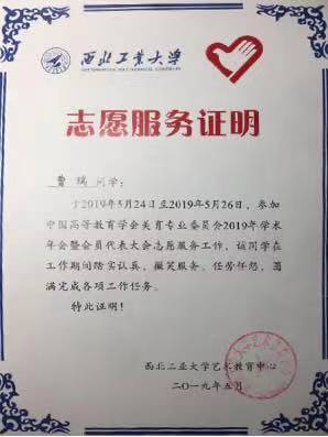 我曾承担中国高等教育学会美育专业委员会2019年学术年会志愿服务工作、承担2020高校科学营志愿服务工作并荣获优秀志愿者称号,承担2020yl6809永利集团筑梦营志愿服务工作并担任总负责人。通过志愿服务,我感受到帮助别人的快乐,充分体会到志愿服务的价值和意义。同时,我还是学校校史馆讲解队的一员,通过讲解校史,我了解了学校脉源三支的历史沿革,感受到了西工大八十年的变化与发展,在对学校产生更浓厚情感的同时,获得了向前奋进的力量。