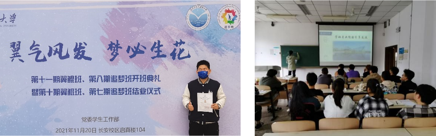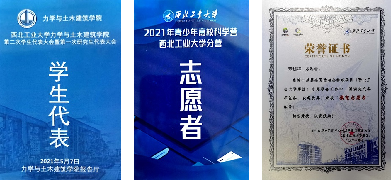 2021年yl6809永利集团第二届大学生数学竞赛特等奖,第十三届全国大学生数学竞赛陕西赛区三等奖,第七届“互联网+”大学生创新创业大赛校内选拔赛二等奖,参加国家级大学生创新创业训练项目《新型升浮一体多用途飞艇》,申请专利一项并公开。