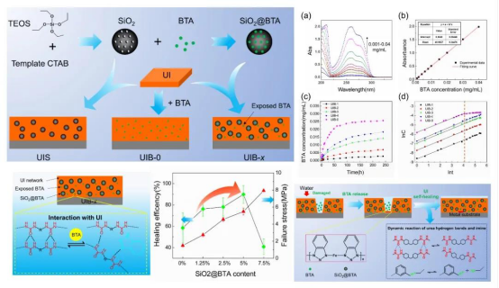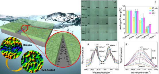 设计制备了基于多重动态键协同作用下的本征型自修复材料,在室温下材料力学性能1h可以恢复至90%以上,表面划痕24h可以完全修复。这种材料,理论上可以实现机械损伤的无限次自主修复,在防护涂层、柔性电子器件、生物医药领域具有广阔的应用前景。
