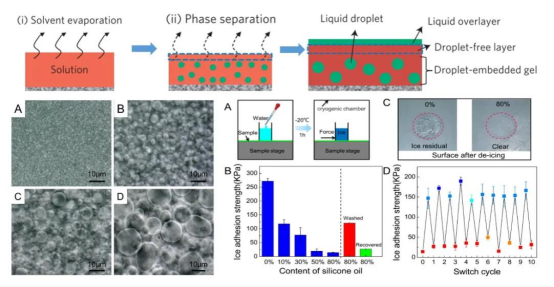 基于之前的自修复材料体系,设计制备了超润滑有机凝胶自修复材料。将自修复材料和二甲基硅油溶于共溶剂中形成均匀的溶液。当溶剂挥发时,会发生相分离过程。最终,二甲基硅油以微液滴的形式均匀分散于基体材料之中,同时在材料表面会形成一层润滑层,使得冰与材料表面的接触形式由固-固接触变成固-液接触,从而大幅降低材料表面的冰结合力。另外,当表面润滑层消耗之后,内部储存的硅油会自动补充,从而起到长久的防结冰效果。未来有望在方冰涂层领域得到应用。