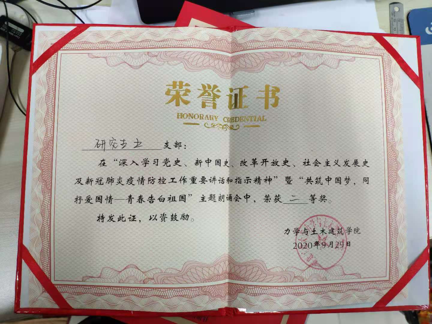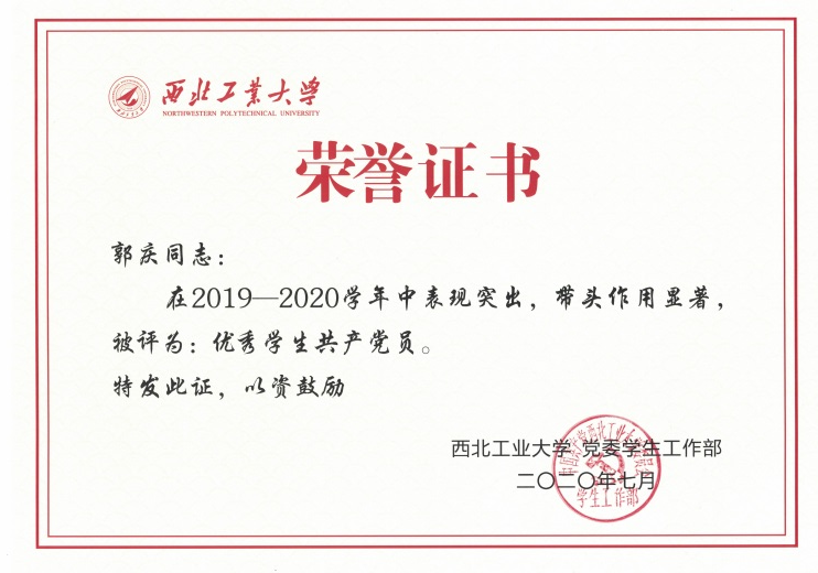 作为共产党员,科研生活中积极发扬党员先锋模范作用。2020年被评为校优秀学生共产党员,全院仅两人。2021年学院授牌“党员先锋岗”。在长期的学生干部工作实践中,积极履行党支部书记、支部委员工作职责,组织参与了大量政治学习教育活动,发扬基层党支部战斗堡垒作用,服务同学,强化联系,带领支部获得“不忘初心、牢记使命”主题朗诵优秀奖、“青春告白祖国”主题朗诵二等奖。本人在支部民主评议中连年评为优秀。积极分享科研经验,指导了多位师弟师妹发表了SCI论文,开展学术论文写作讲堂,分享写作经验。协助导师参与管理课题组日常工作,主持每周组会,管理相关科研项目。疫情期间,积极参与家乡志愿服务,在防疫防控检查点进行停车登记工作。始终牢记党员服务意识、奉献意识,展示党员良好形象。