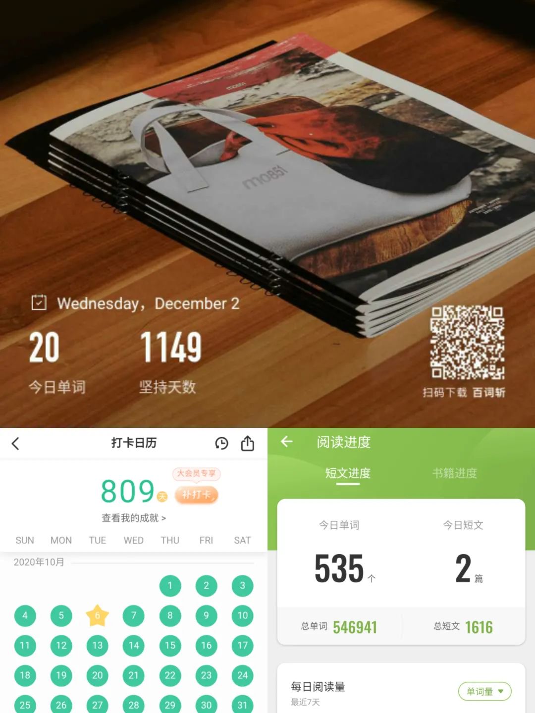 提到外语特别是英语学习,我想说:每天进步一点。过去三年来我学习英语的状态便是很好阐释了它。高考时我的英语成绩并不理想,仅125分,而进入本科后,我每天早上都坚持背英语单词以及进行英语阅读,百词斩连续打卡千余日,扇贝单词打卡800余日,扇贝阅读累计阅读短文超1600篇总词数超50万词,几乎每周的学校英语角都会有我的身影……我想这些点点滴滴坚持便是英语从高考125分到CET-4 513分再到CET-6 574分和TOEFL 84分的原因吧。我现在正在学习德语二外,在这个从零开始过程中,我再一次地感受了坚持不懈的作用,我很喜欢我们高中班级的窗上贴的一句话——“I will persist until I succeed”,我想,这就是学习外语的态度。